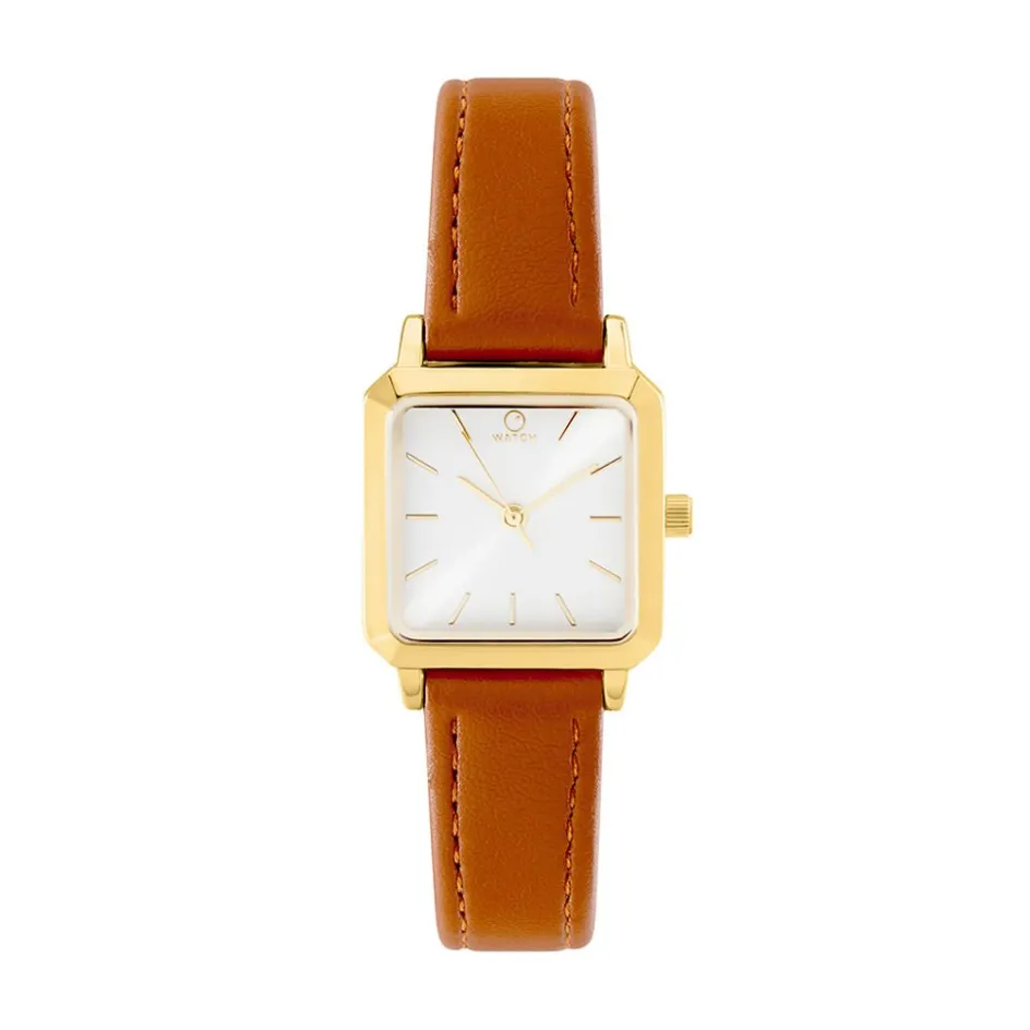 Montre Owatch Square Alliage Dore Carree Quartz 24mm Fond Blanc Bracelet Synthetique Marron