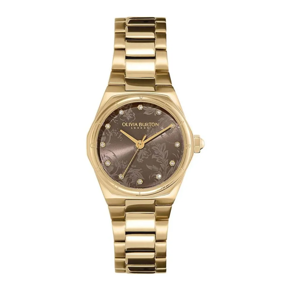 Montre Olivia Burton Mini Hexa Acier Doré Ronde Quartz 28mm Fond Marron Motif Fleurs Bracelet Acier Doré 24000107