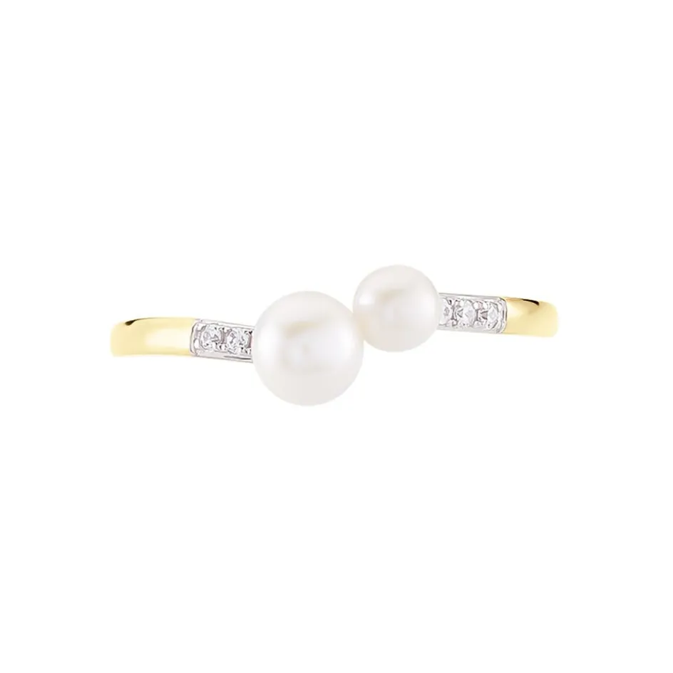Bague Or Jaune 375/1000 2 Perles De Culture Blanches Rondes Accompagnées Oxydes De Zirconium