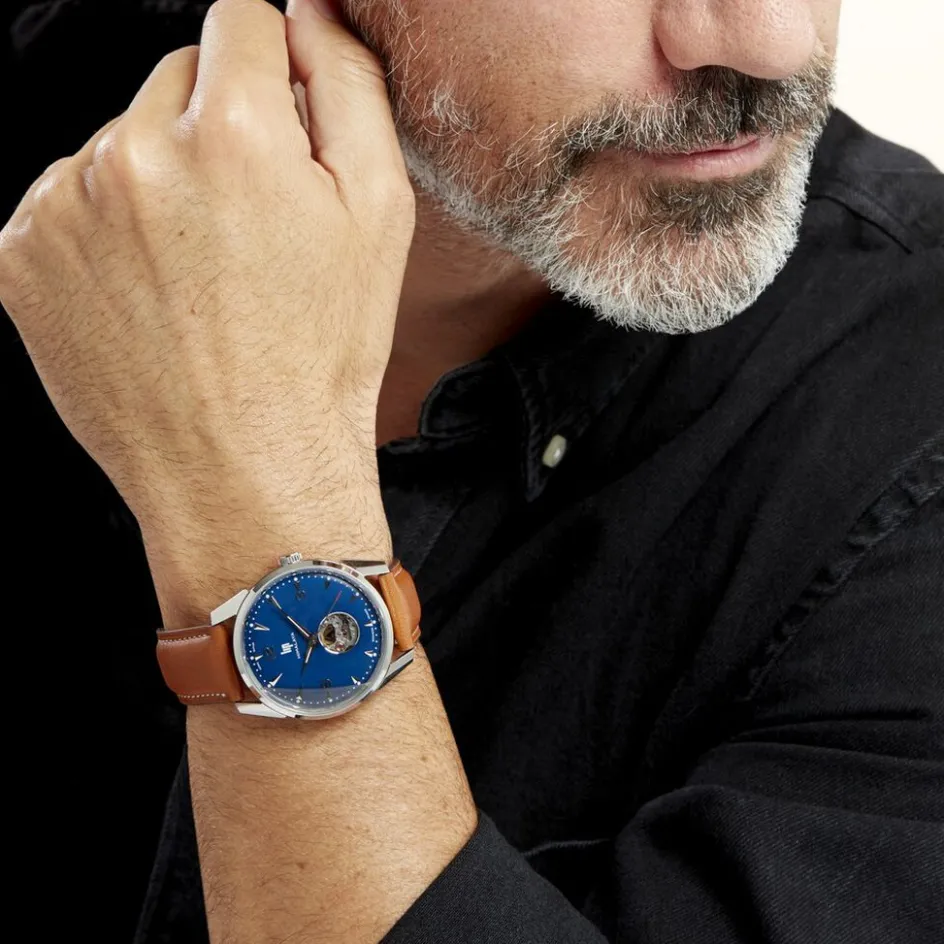 Montre Lip Himalaya C艙ur Battant Acier Argenté Rond Automatique 40mm Fond Bleu Bracelet Cuir Marron 671585