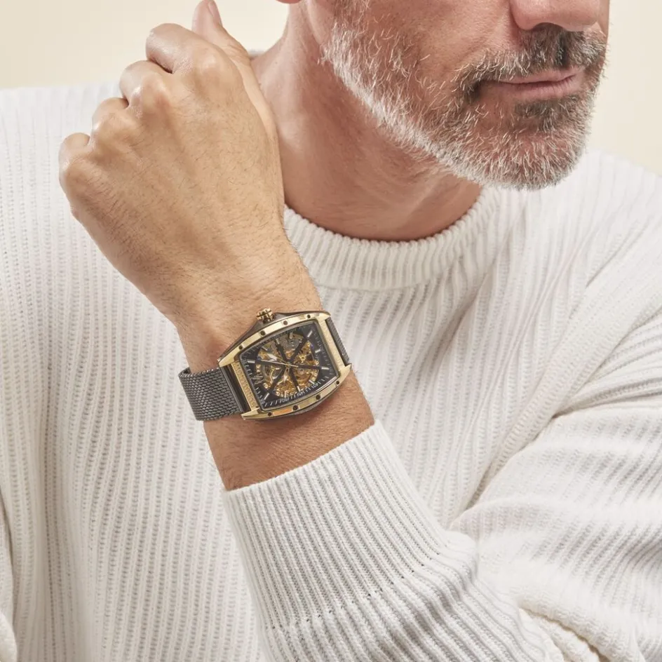 Montre Montignac Tonneau Automatique Acier Doré Tonneau Auto 45mm Fond Noir Bracelet Acier Milanais Noir Mow413