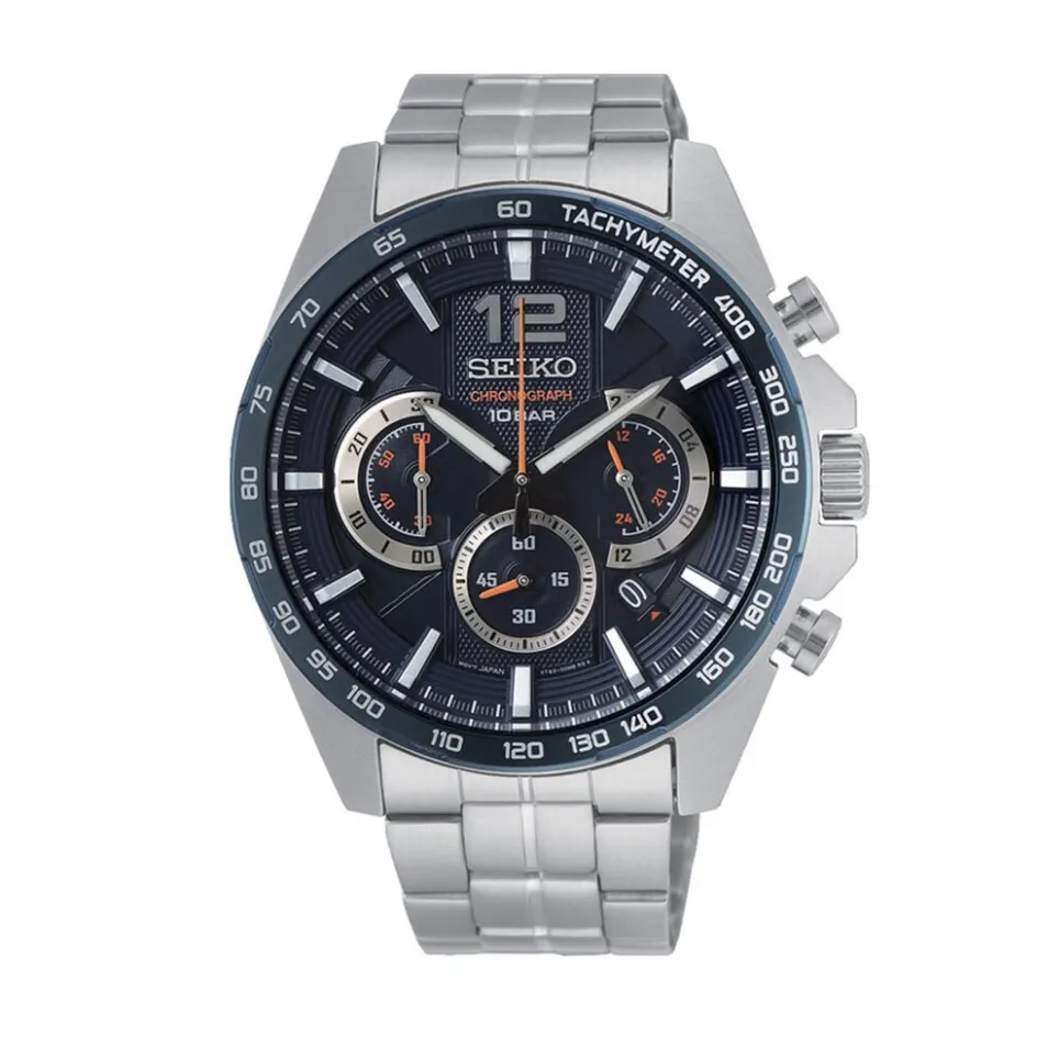 Montre Seiko Sport Acier Ronde Quartz 43.9mm Fond Bleu Lunette Bleue Bracelet Acier Ssb345p1