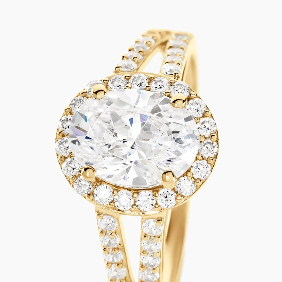 Bague Or Jaune 375/1000 1 Oxyde Central Oval Entourage Double Rangs Oxydes De Zirconium
