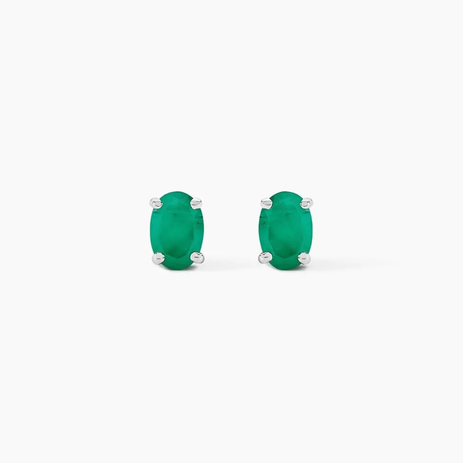 Boucles D’oreilles Or Blanc 375/1000 Puces Emeraudes Forme Ovale