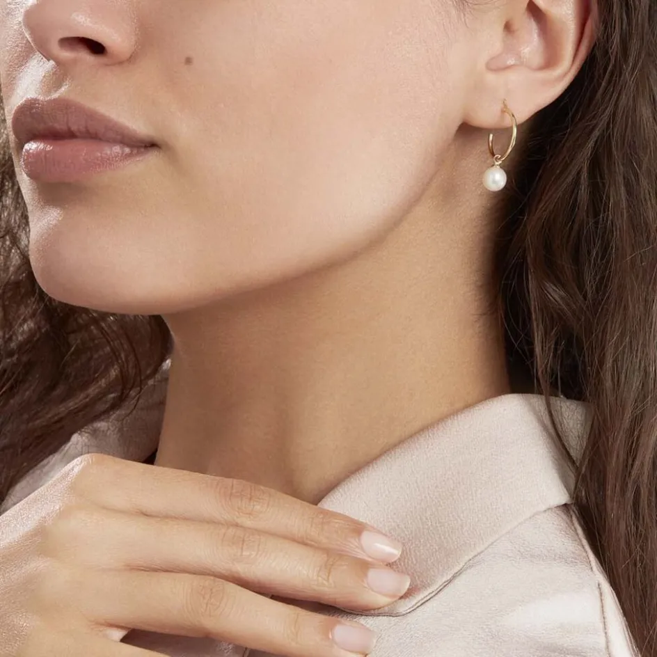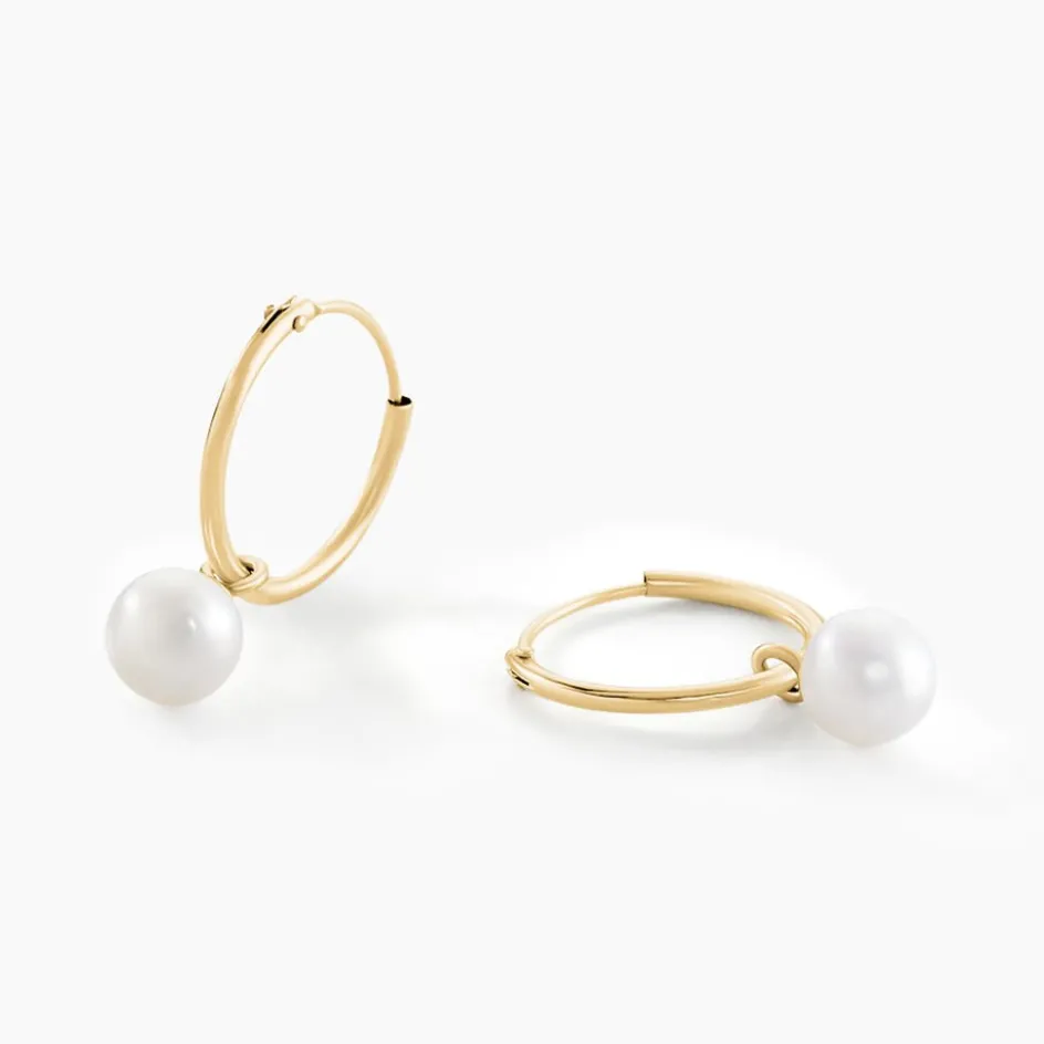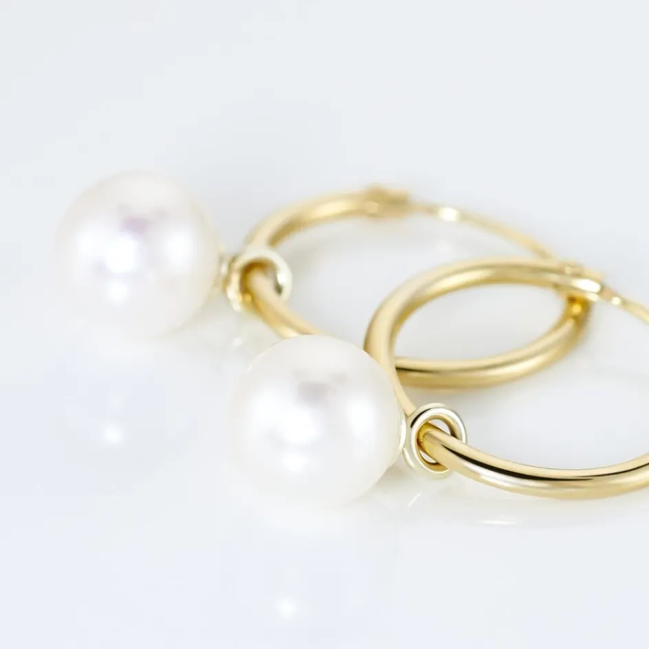 Creoles Or Jaune 375/1000 Perles De Cultures Rondes Blanches 6/7mm Diam 15mm