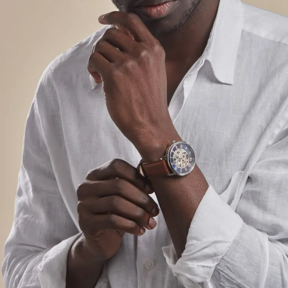 Montre Pierre Lannier Collection Week-end Acier Blanc Ronde Automatique 40mm Fond Bleu Bracelet Cuir Marron 322b164
