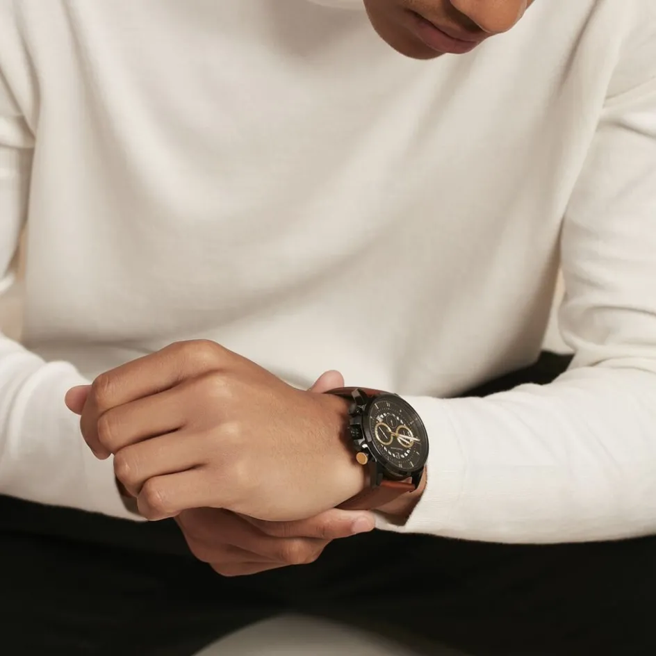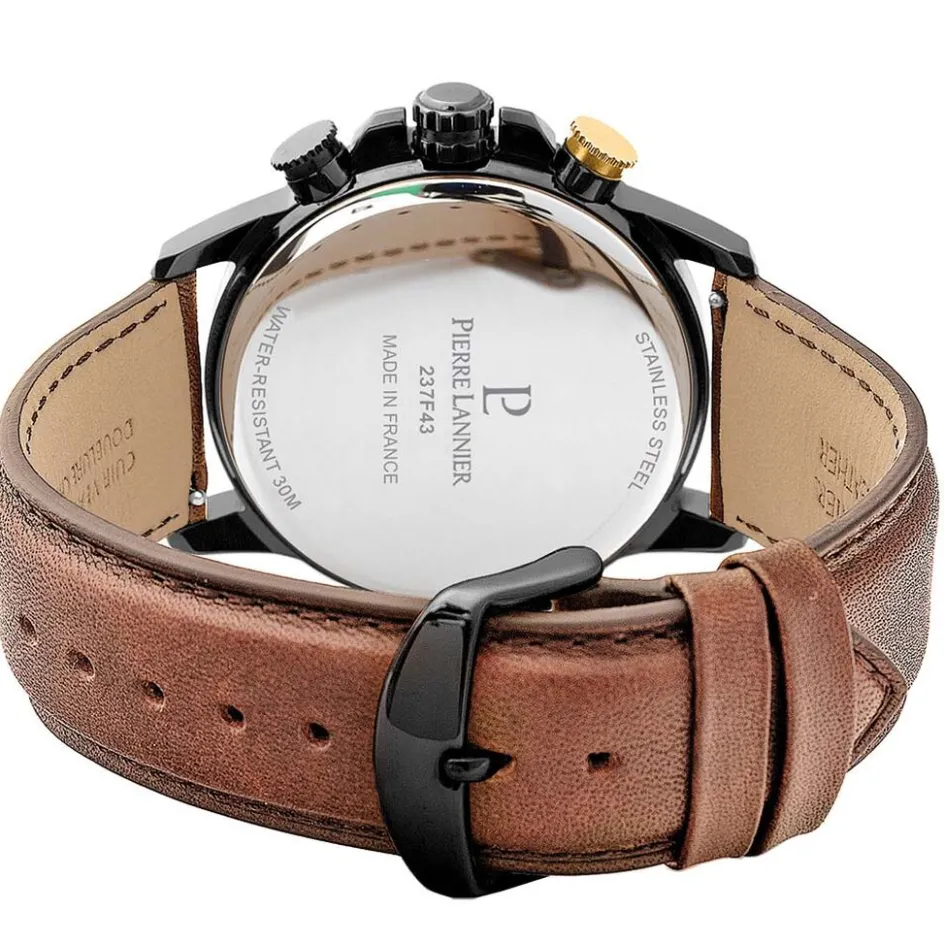 Montre Pierre Lannier Sentinelle Acier Noir Ronde Quartz Chronographe 44mm Fond Noir Bracelet Cuir Brun 237f434