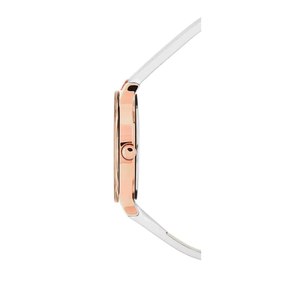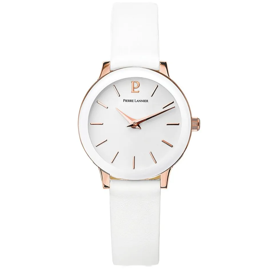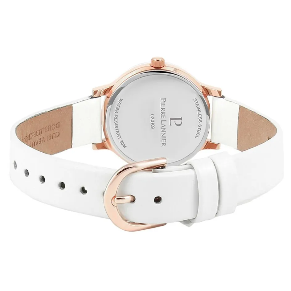 Montre Pierre Lannier Week End Ligne Pure Acier Dore Ronde Quartz 28mm Fond Blanc Bracelet Cuir Blanc 023k900