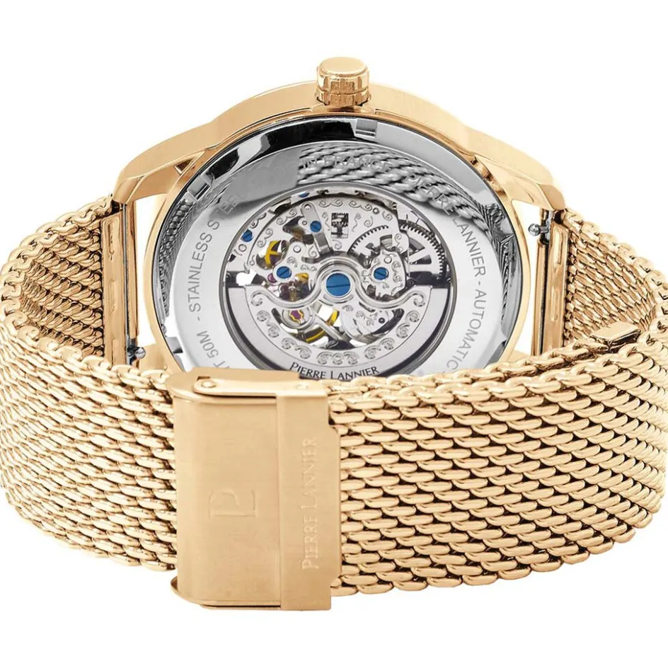 Montre Pierre Lannier Automatique Acier Doré Ronde Automatique 44mm Fond Noir Bracelet Acier Maille Milanaise Doré 326c032