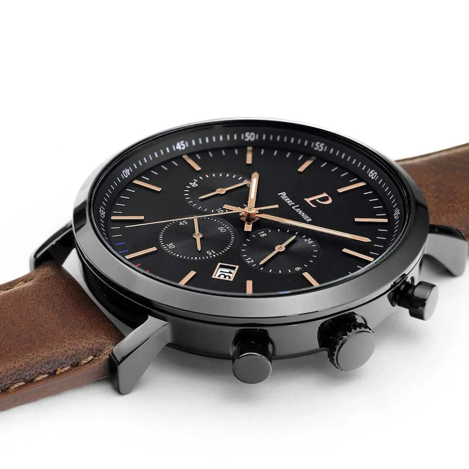 Montre Pierre Lannier Baron Acier Noir Ronde Quartz Multifonction 43mm Fond Noir Bracelet Cuir Brun 222g434