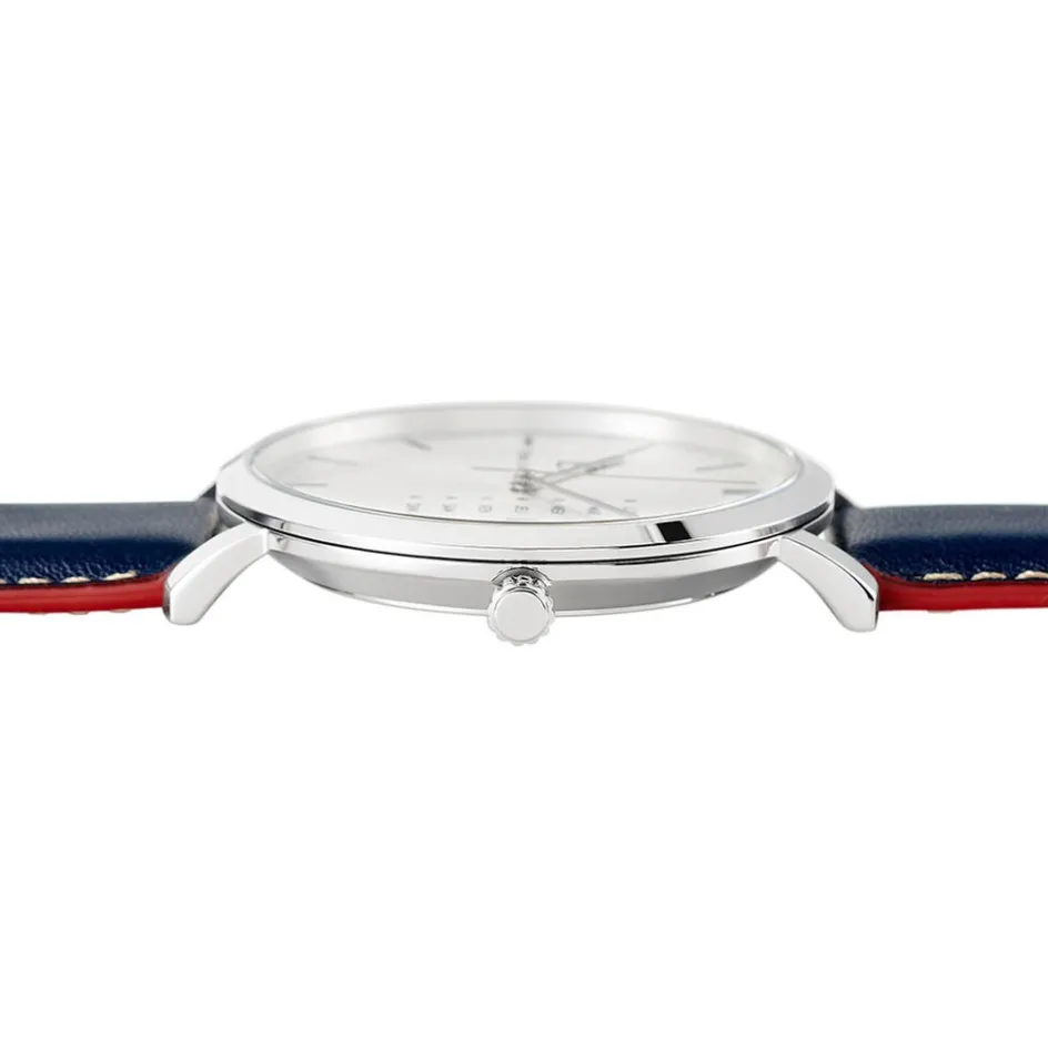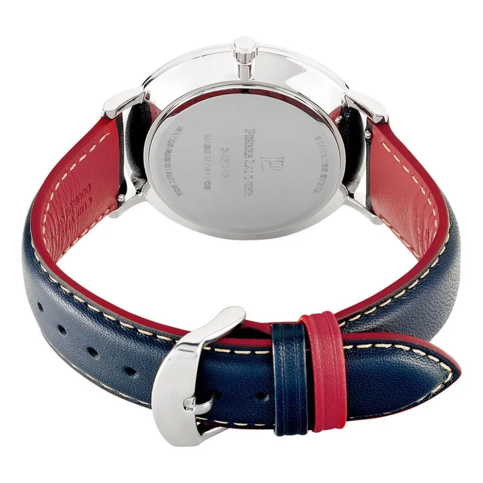Montre Pierre Lannier Data Acier Argente Ronde Quartz 42mm Fond Argente Bracelet Cuir De Veau Bleu 242d126