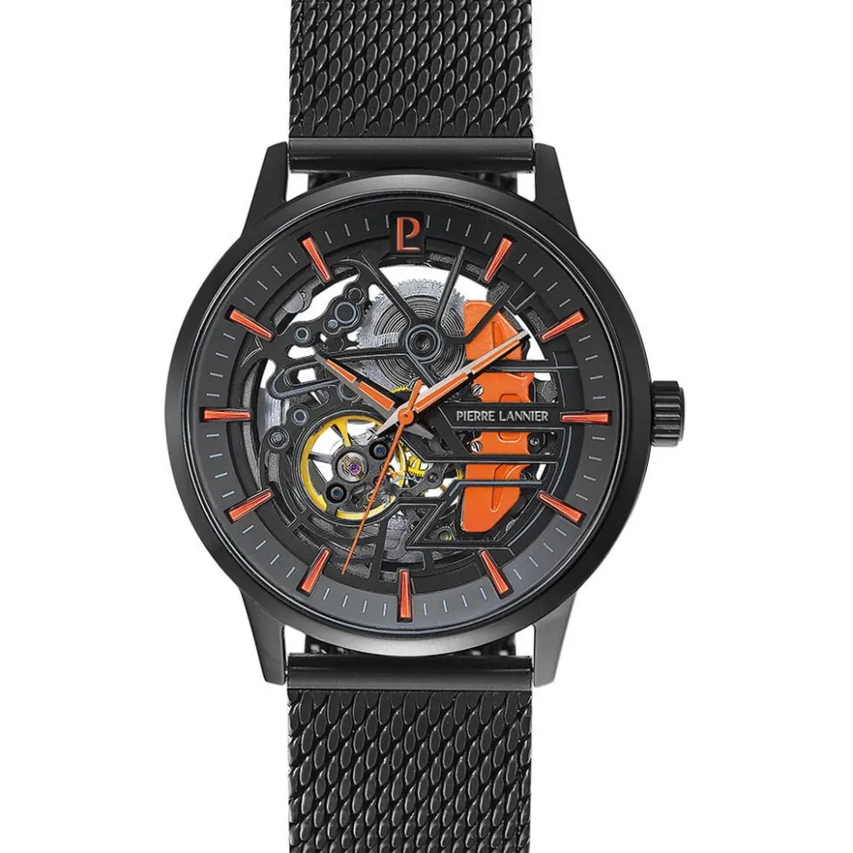 Montre Pierre Lannier Paddock Acier Noir Ronde Automatique 43mm Fond Noir Et Orange Bracelet Acier Noir Milanais 345a499