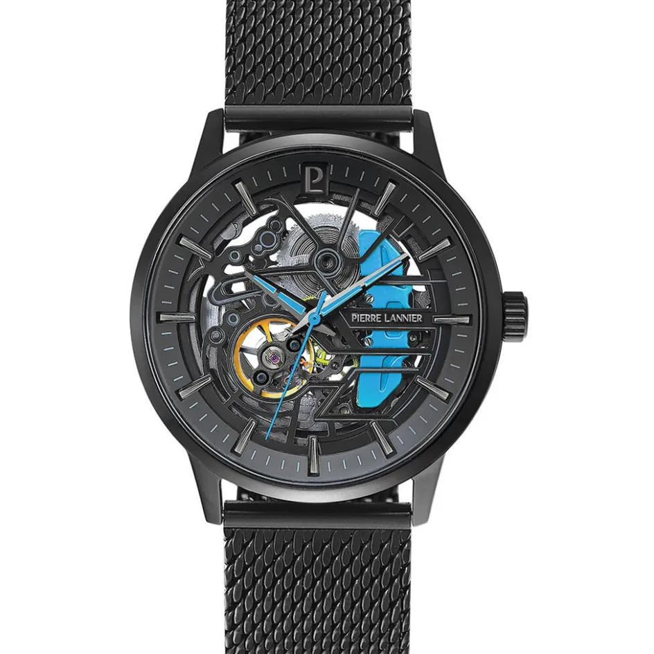 Montre Pierre Lannier Paddock Acier Noir Ronde Automatique 43mm Fond Noir Et Bleu Bracelet Acier Noir Milanais 345a469