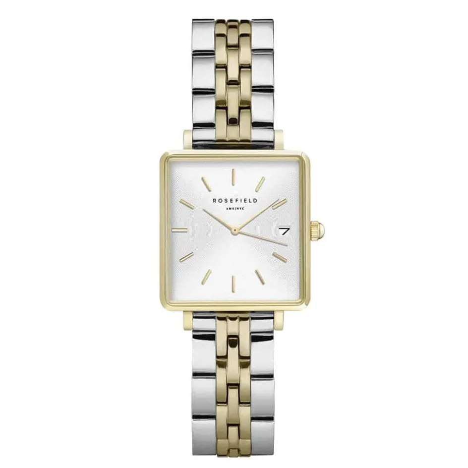 Montre Rosefield Boxy Xs Acier Doré Carré Quartz 22x24mm Fond Blanc Bracelet Acier Bicolore Qmwssg-q023