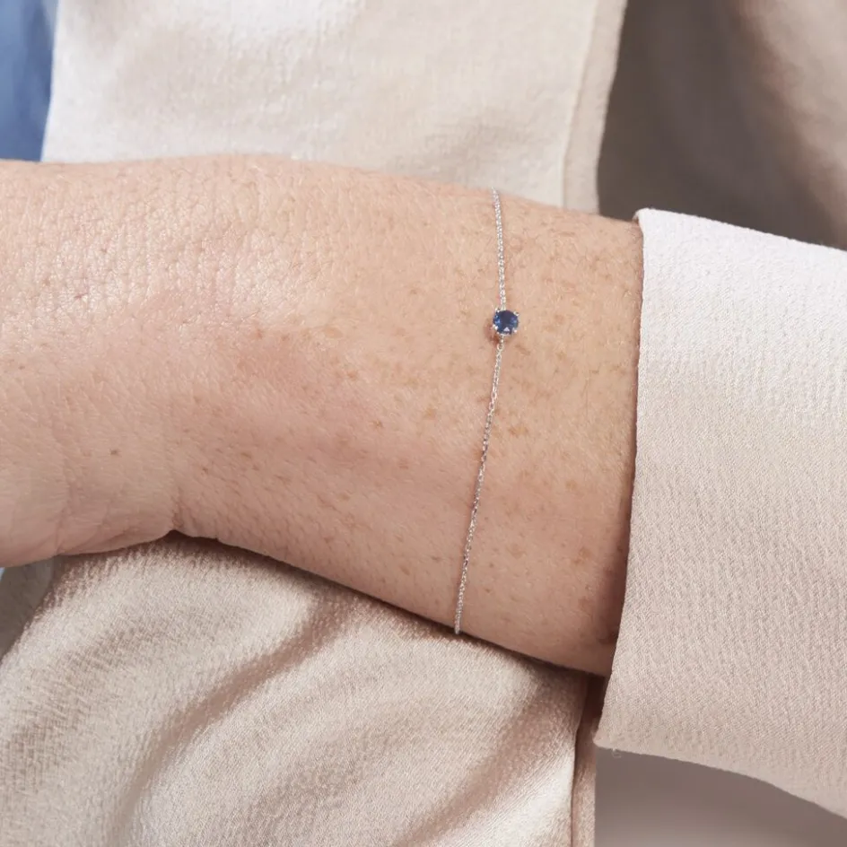 Bracelet Solitaire Or Blanc 375/1000 Saphir Serti Griffes 0.12ct Maille Forçat 15cm