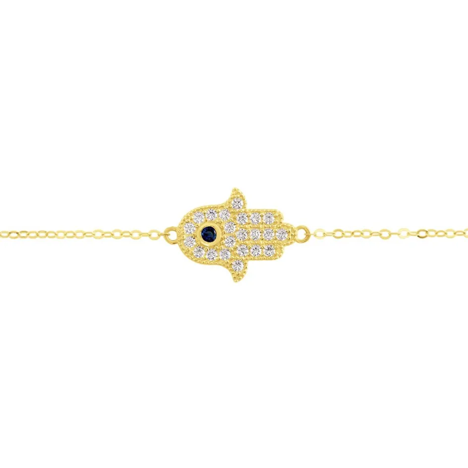 Bracelet Or Jaune 375/1000 Motif Main De Fatma Pavage Oxydes Blancs Et Bleu Maille Forçat 16+2 Cm