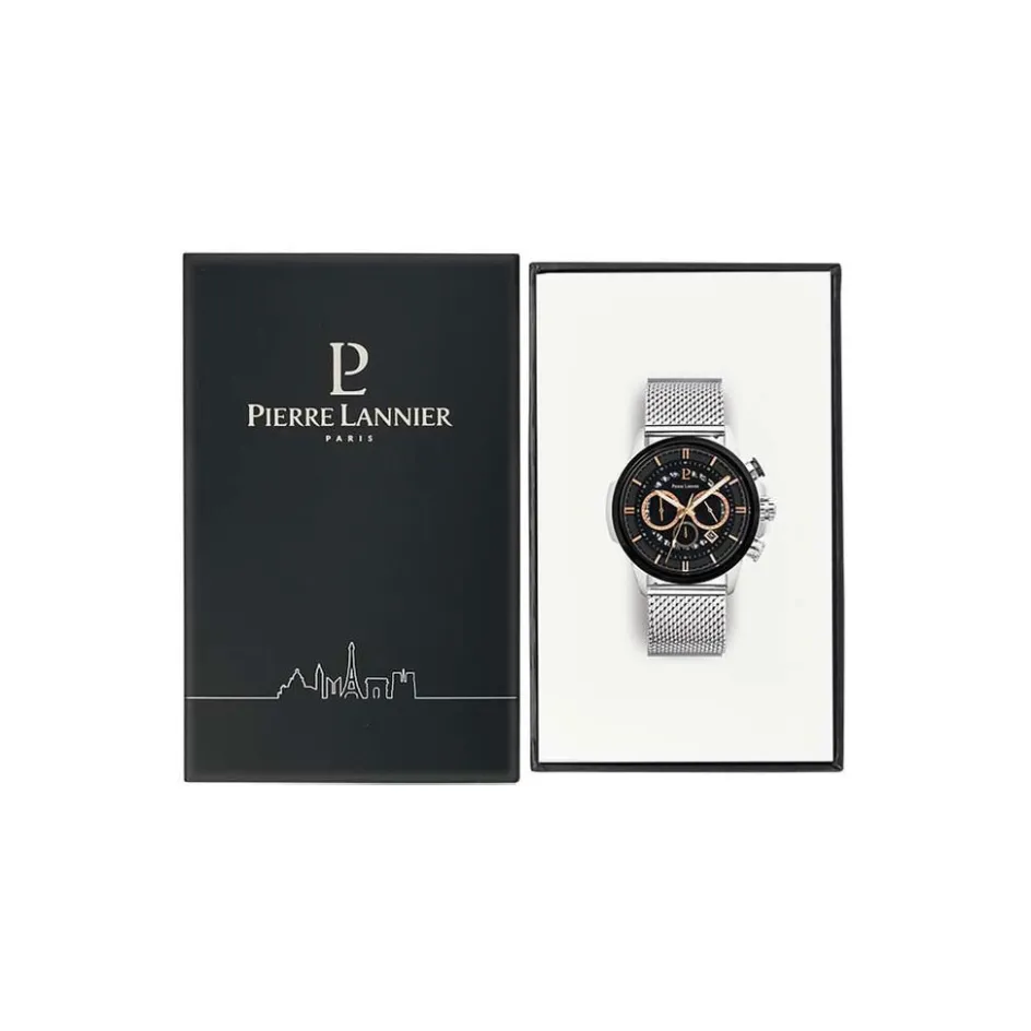 Montre Pierre Lannier Sentinelle Acier Argenté Ronde Quartz Chronographe 44mm Fond Noir Bracelet Milanais Acier Argenté 236d131