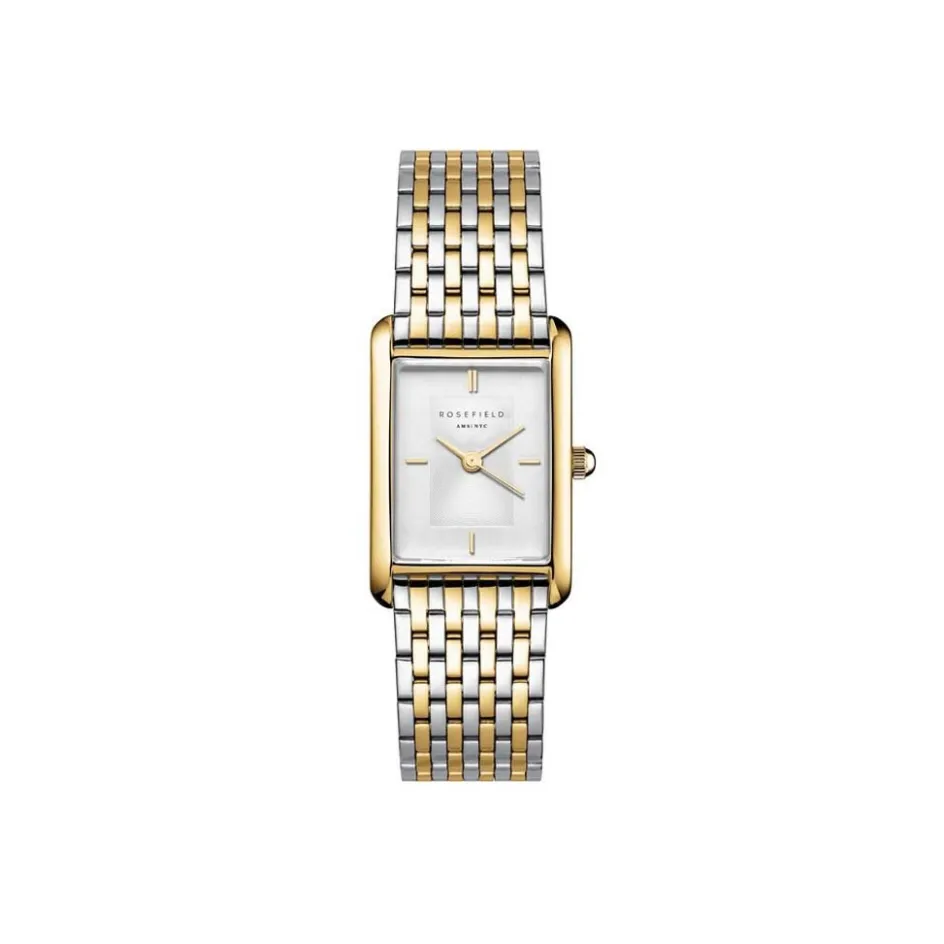 Montre Rosefield Heirloom Laiton Dore Rectangulaire Quartz 23.5mmx30.6mm Fond Blanc Bracelet Acier Bicolore Dore Blanc Hwdsg-h03