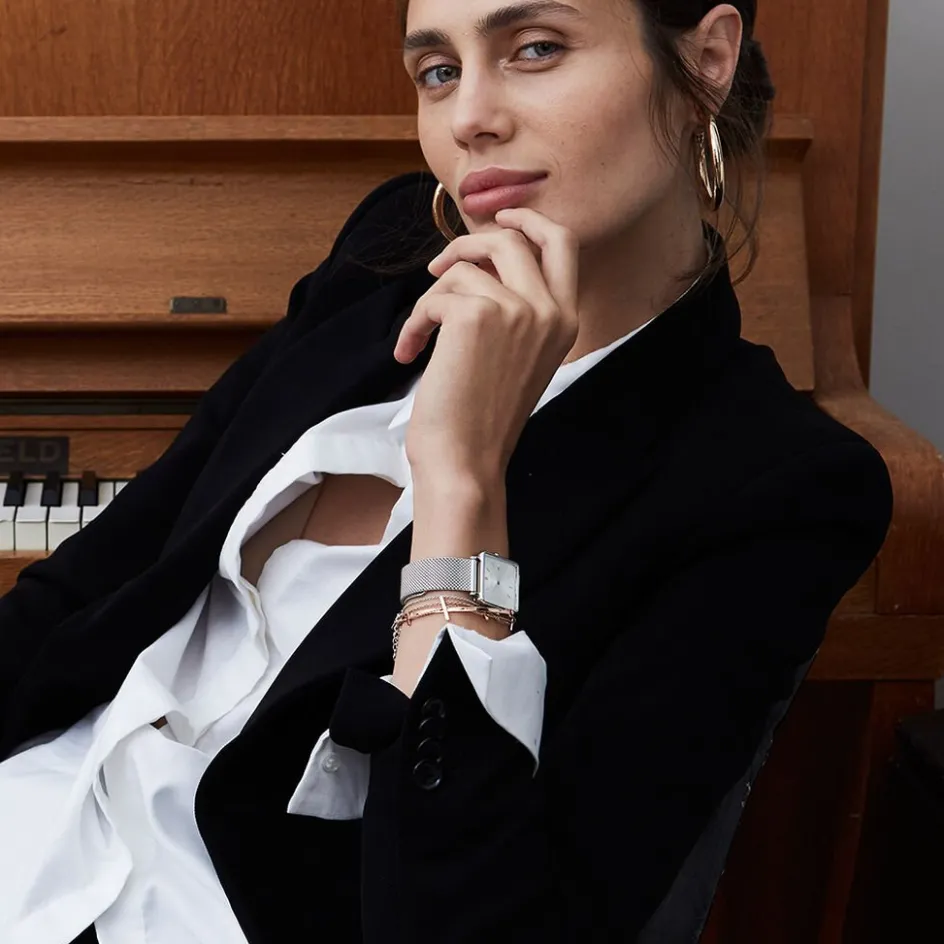 Montre Rosefield Boxy Acier Argenté Carré Quartz 26x28mm Fond Blanc Bracelet Milanais Acier Argenté Qwss-q02