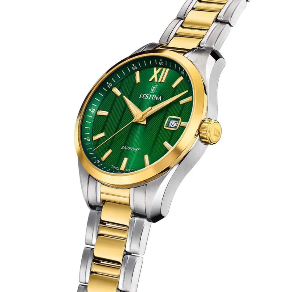 Montre Festina Swiss Made Acier Bicolore Dore Blanc Ronde Quartz 37.5mm Fond Vert Bracelet Acier Bicolore Dore Blanc F20027/3