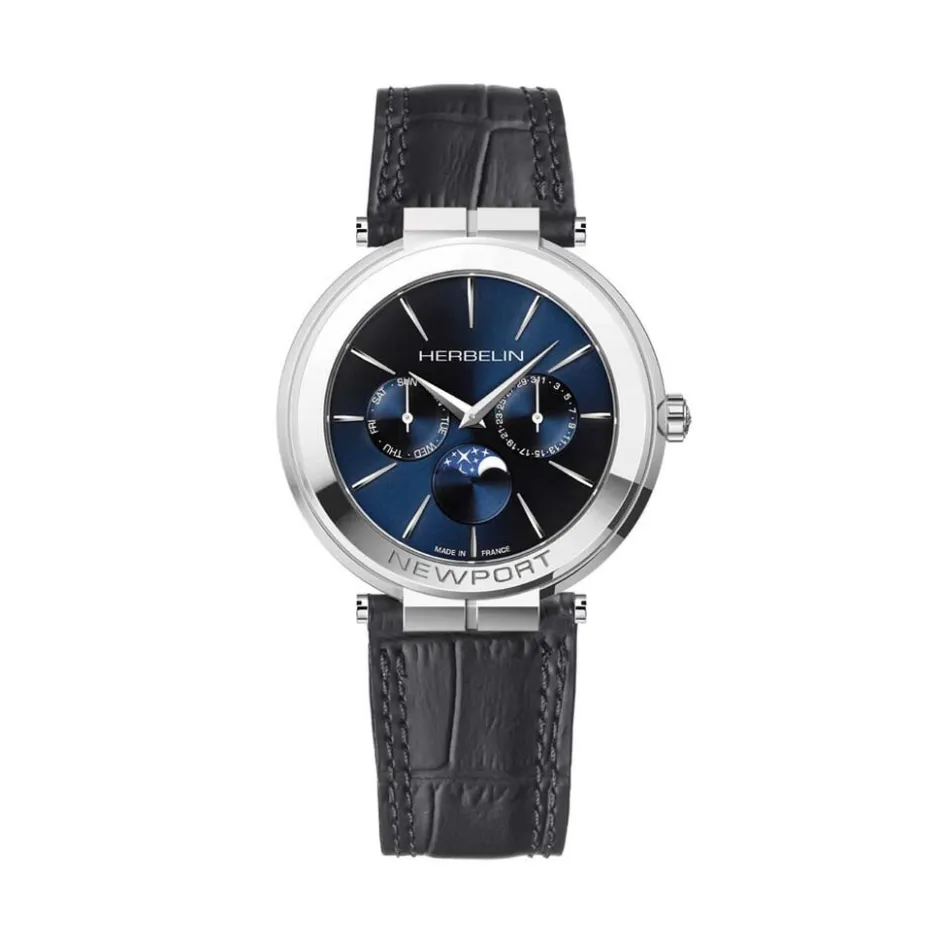Montre Herbelin Newport Slim Acier Argente Ronde Quartz 41.5mm Fond Bleu Bracelet Cuir De Vachette Noir 12722ap15