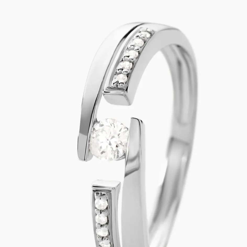 Solitaire Or Blanc 375/1000 Diamant Rond Serti Couteau Accompagne Diamants