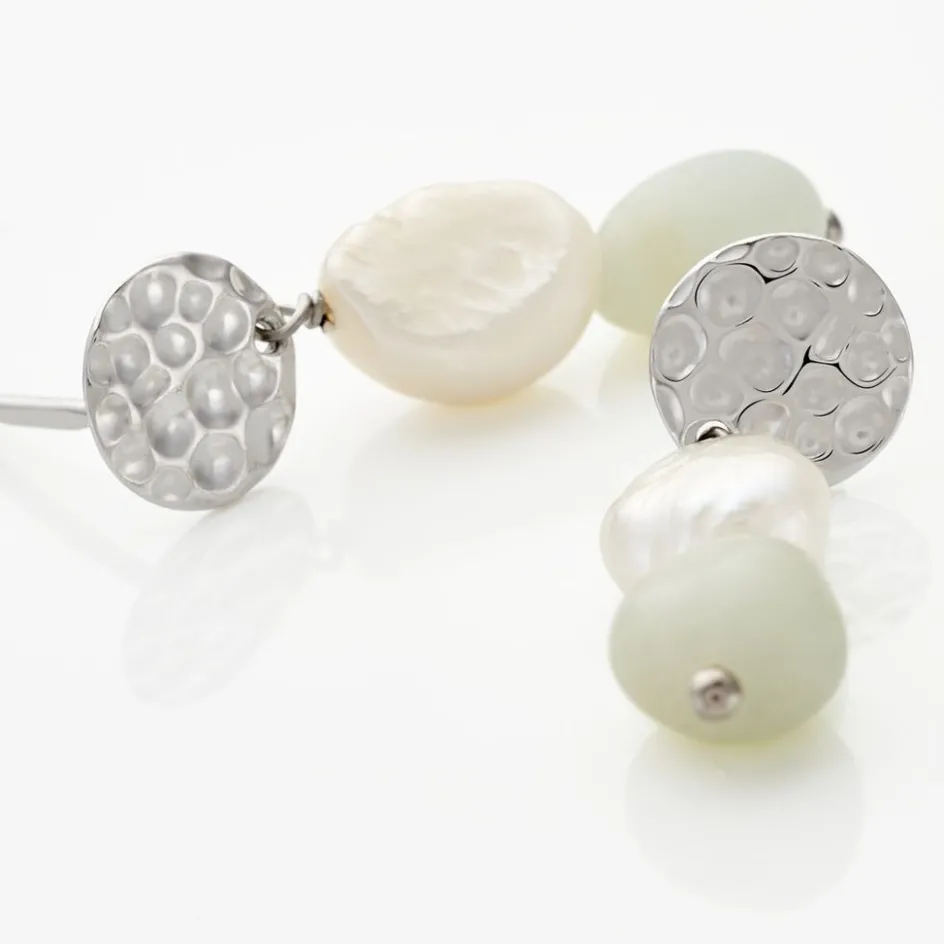 Boucles D’oreilles Pendantes Argent Blanc 925/1000 Pastilles Martelées Amazonites Vertes Et Perles De Culture
