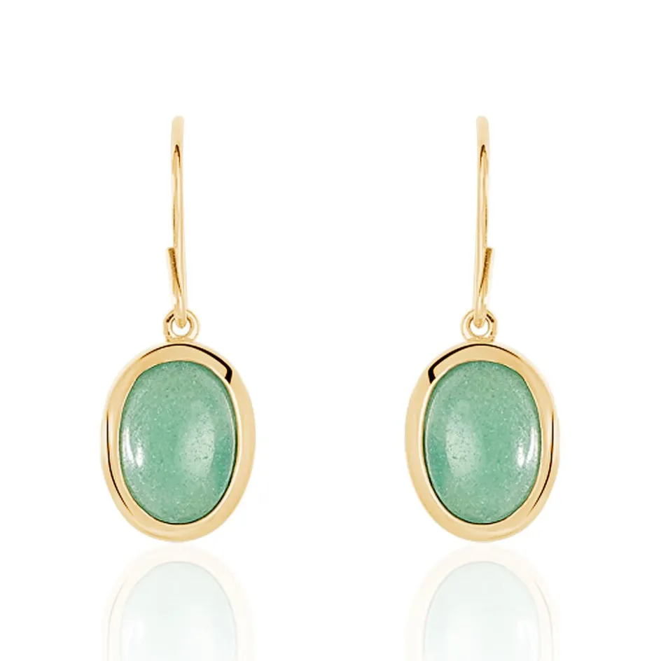 Boucles D’oreilles Pendantes Plaqué Or Jaune Avec Aventurines Ovales Vertes Serti Clos