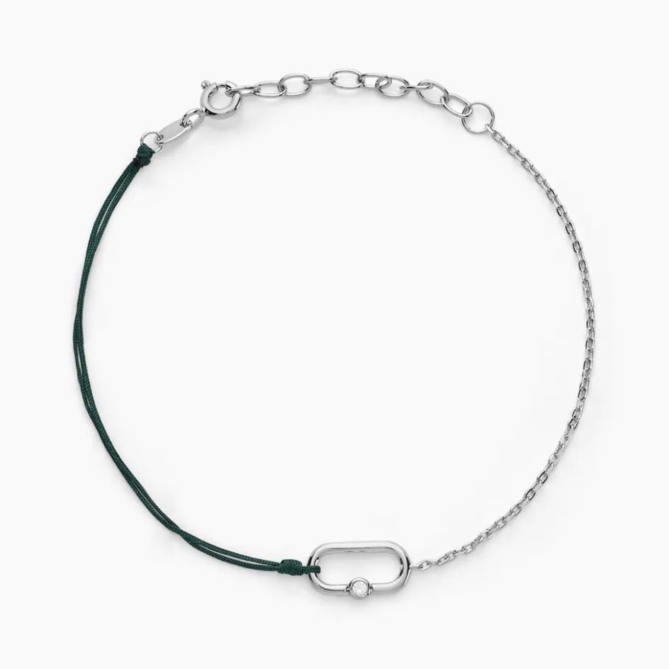 Bracelet Argent Blanc 925/1000 Maillon Ovale Oxyde De Zirconium Serti Clos Cordon Vert Et Maille Jaseron 16+3cm
