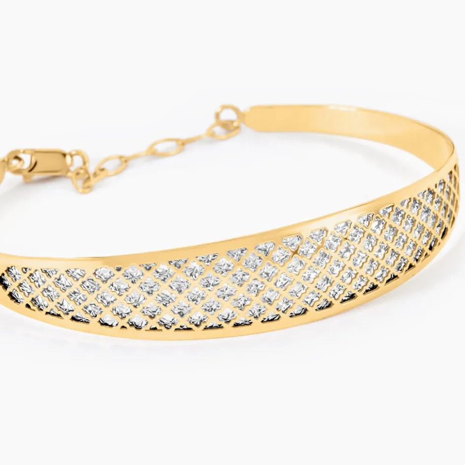 Bracelet Jonc Bicolore Or 750/1000 Fil Plat Motif Quadrillage Ajoure