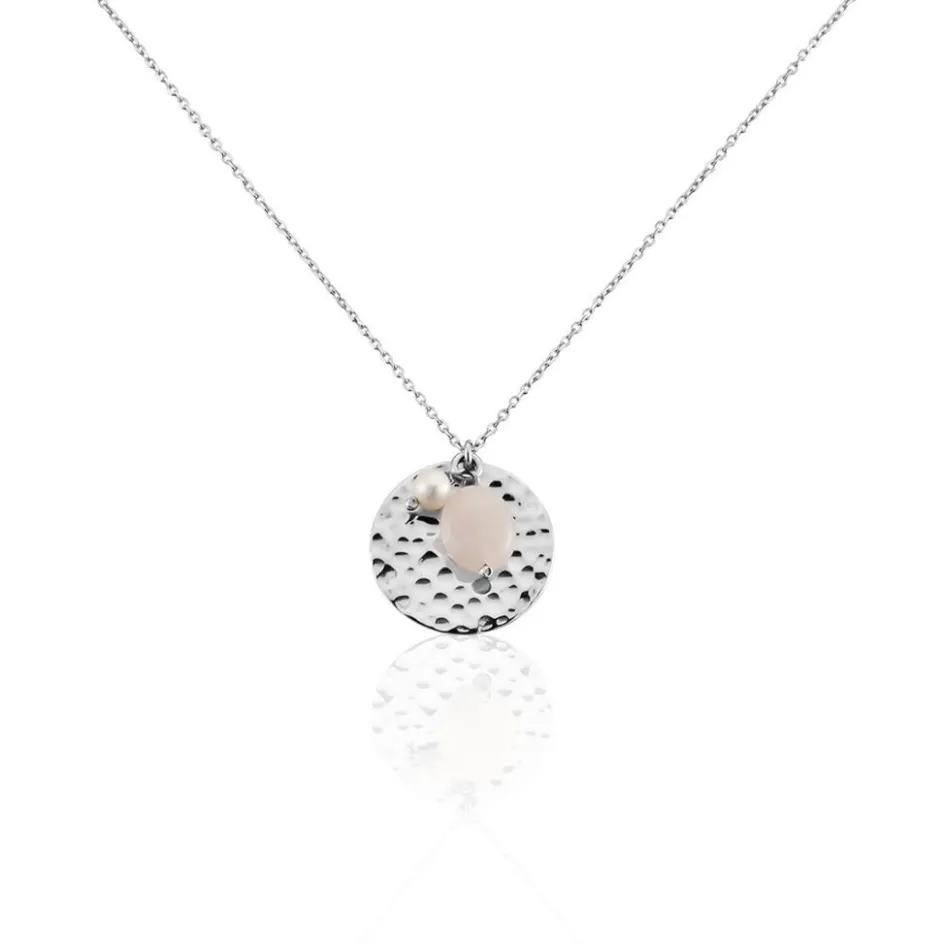 Collier Argent Blanc 925/1000 Pastille Martelée Quartz Rose Et Perle De Culture Maille Forcat 45cm