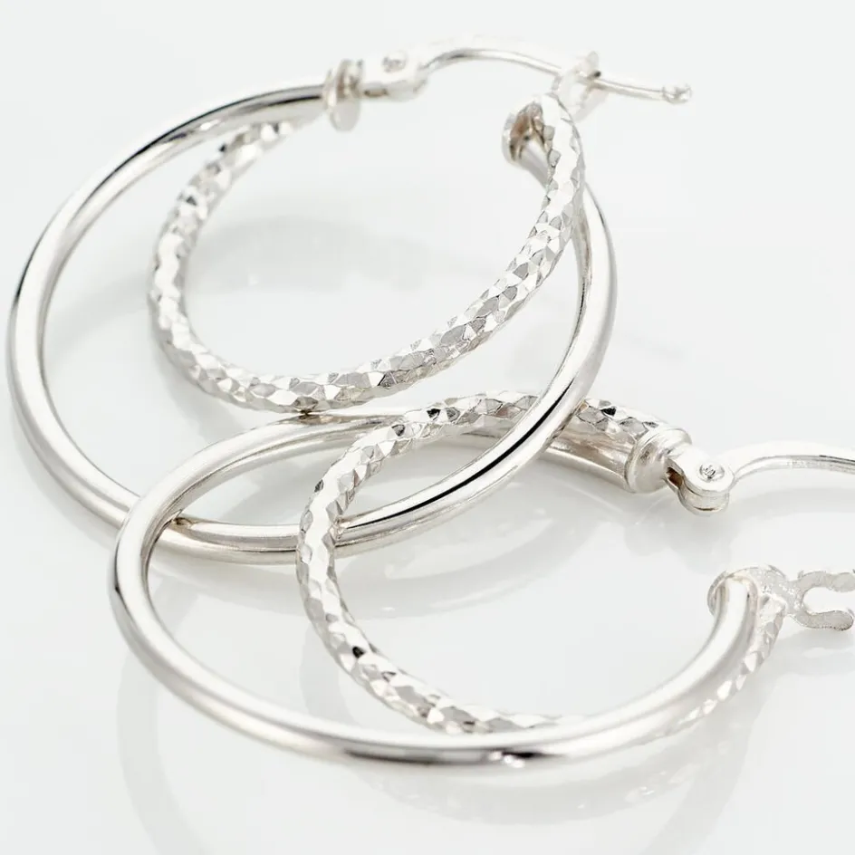 Créoles Argent Blanc 925/1000 Double Fil 1 Lisse 1 Diamante Largeur 1.5mm Diametre 20mm