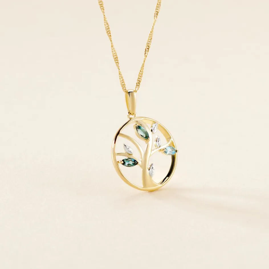 Pendentif Or Jaune 375/1000 Arbre De Vie Topazes London Blue Formes Navettes