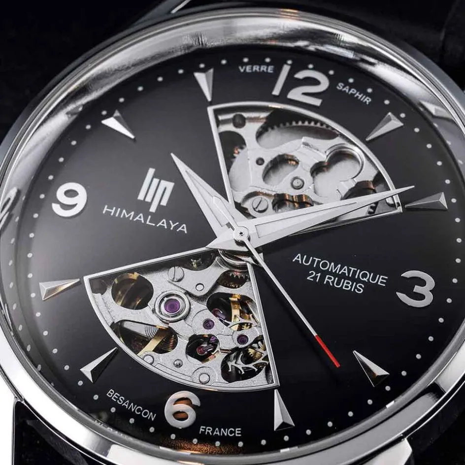Montre Lip Himalaya Sablier Acier Argenté Rond Automatique 40mm Fond Noir Bracelet Cuir Noir 671573