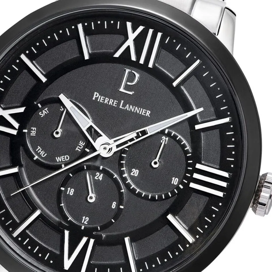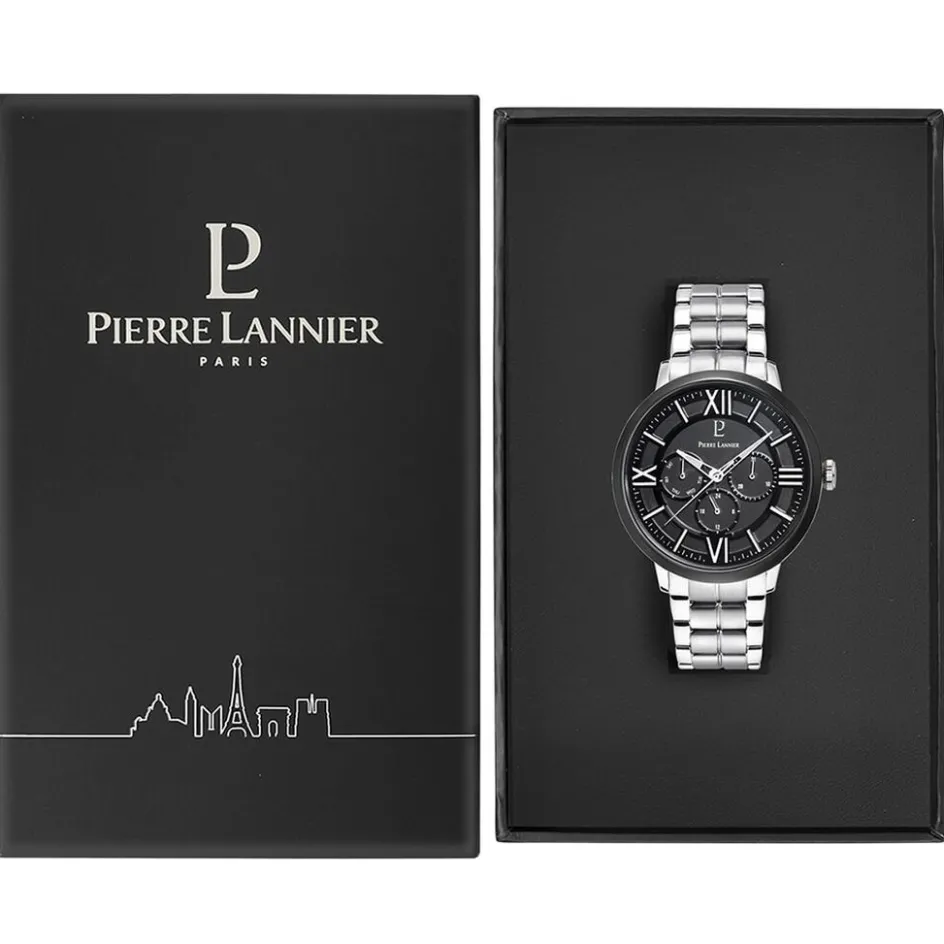Montre Pierre Lannier Collection Beaucour Acier Blanc Ronde Quartz 42mm Fond Noir Bracelet Acier Blanc 256f131