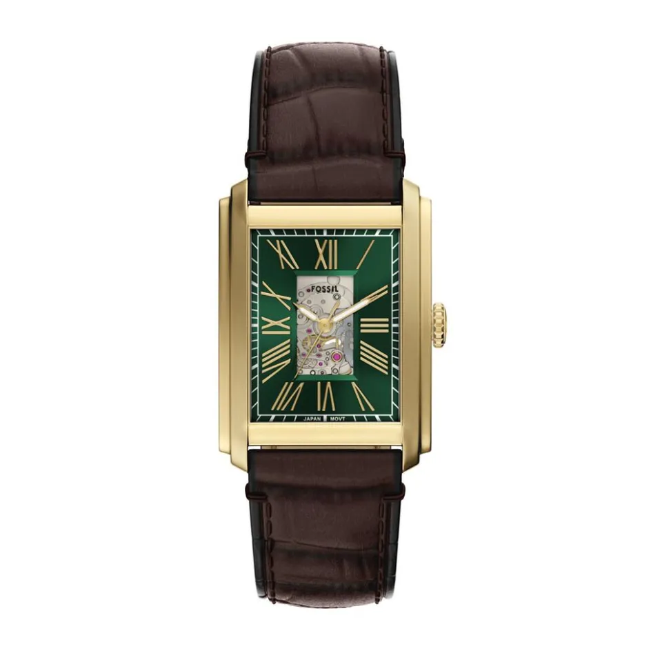 Montre Fossil Carraway Automatic Acier Inoxydable Doré Automatique Rectangulaire 30Mm Fond Vert C艙ur Ouvert Bracelet Cuir De Vache Marron Me3271