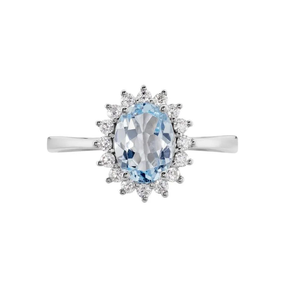 Bague Or Blanc 375/1000 Topaze Sky Blue 1.5 Cts Serti 4 Griffes Entourage Marguerite Oxydes
