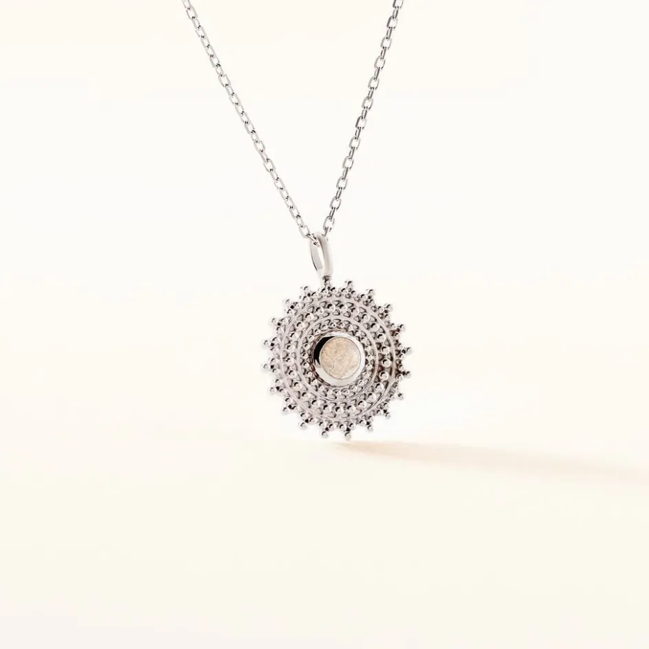 Collier Argent Blanc 925/1000 Rosace Perlee Labradorite Ronde Centrale Maille Forcat 45cm