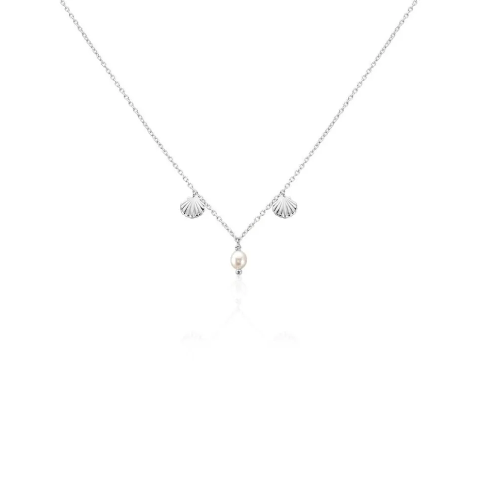 Collier Argent Blanc 925/1000 Pampilles Coquillages Et Perle De Culture Maille Jaseron 42+3cm