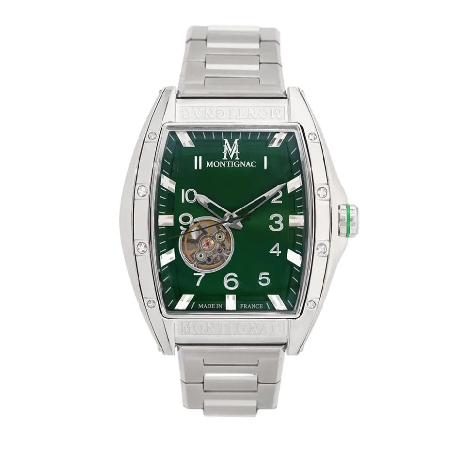 Montre Montignac Tonneau Automatique Acier Argente Tonneau Automatique 53.7mmx45mm Fond Vert Bracelet Acier Argente Mow1008