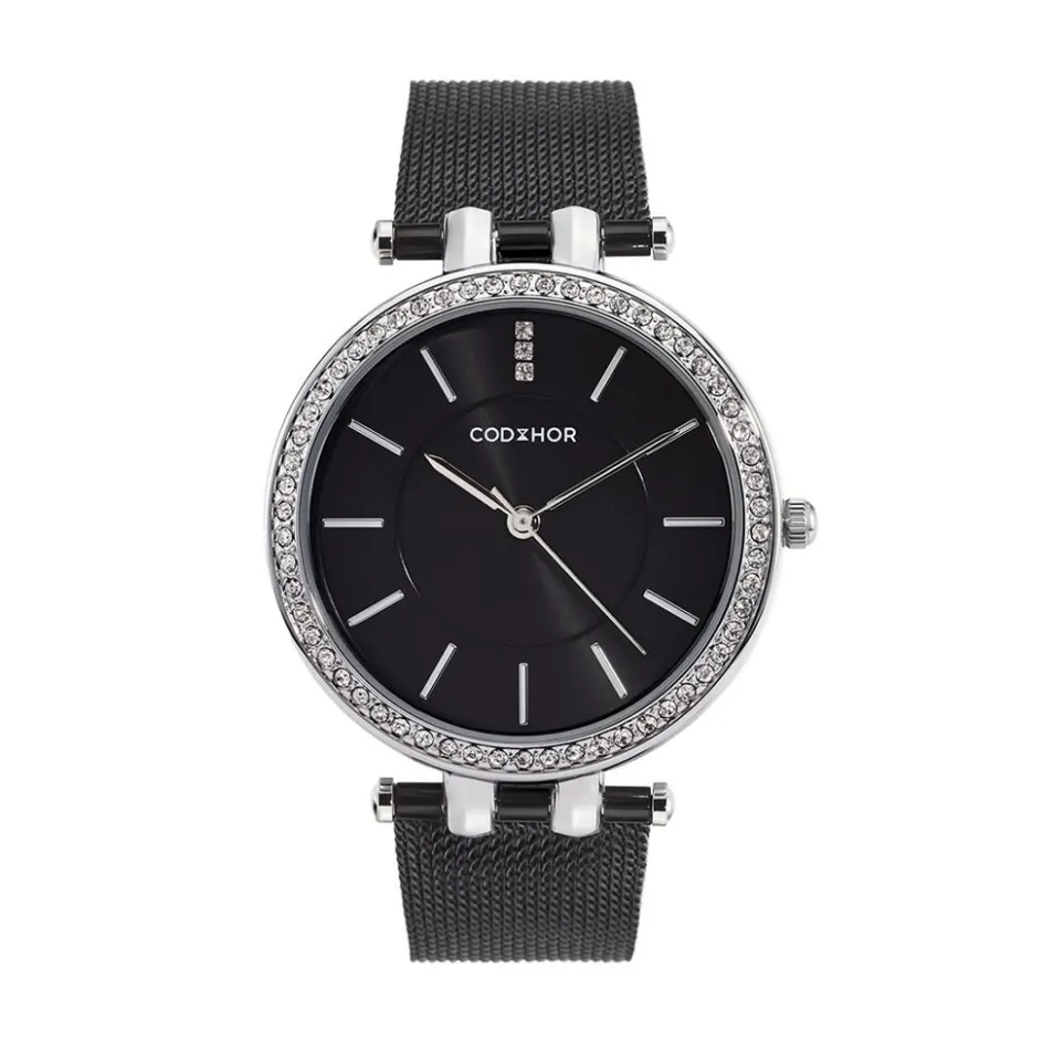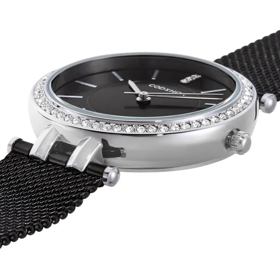 Montre Codhor Celinia Alliage Argenté Ronde Quartz 35mm Lunette Strass Fond Noir Bracelet Milanais Acier Noir Wba0093-005