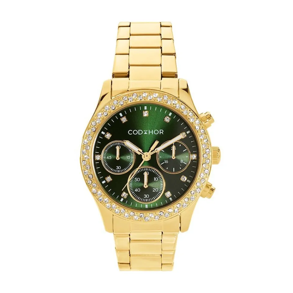 Montre Codhor Julia Alliage Doré Ronde Quartz Chronographe 36mm Lunette Strass Fond Vert Bracelet Alliage Doré Ch.4663l/05m