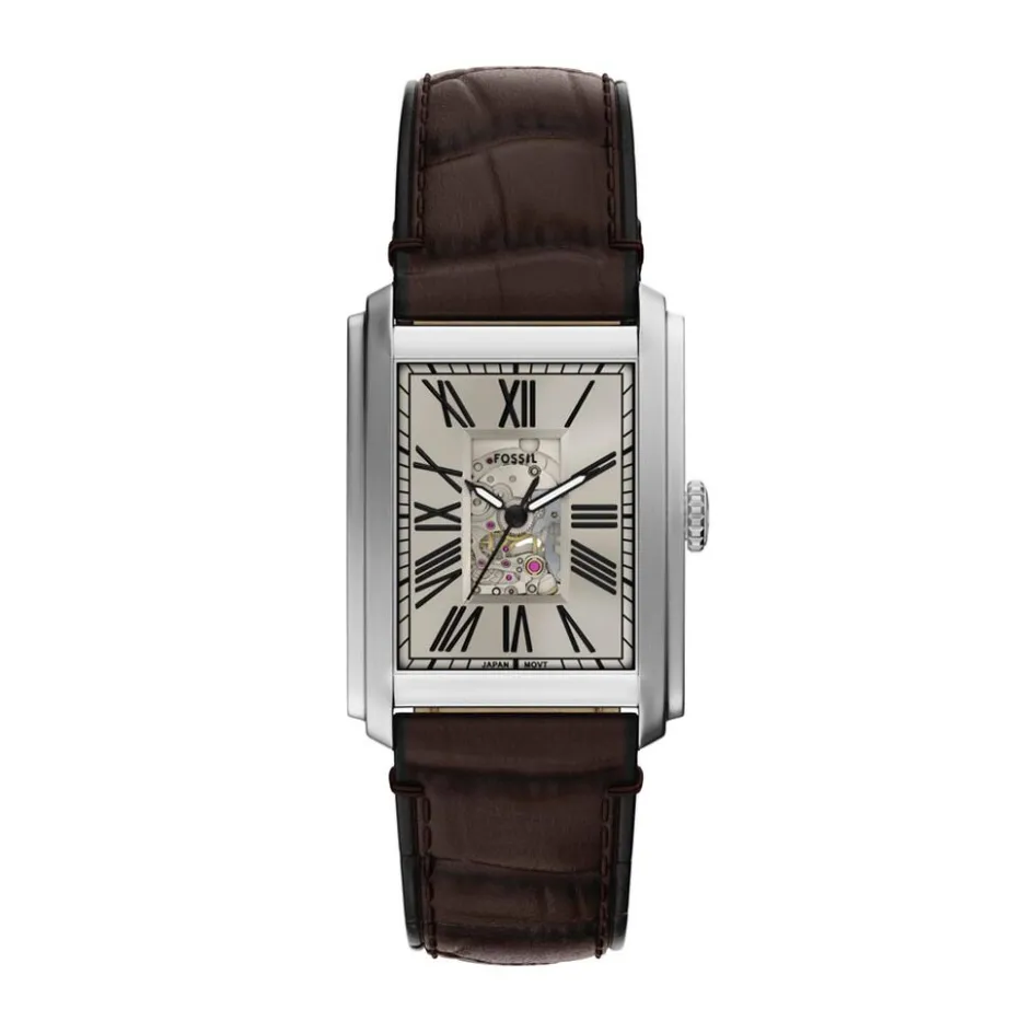 Montre Fossil Carraway Automatic Acier Inoxydable Argenté Automatique Rectangulaire 30Mm Fond Beige C艙ur Ouvert Bracelet Cuir De Vache Marron Me3272