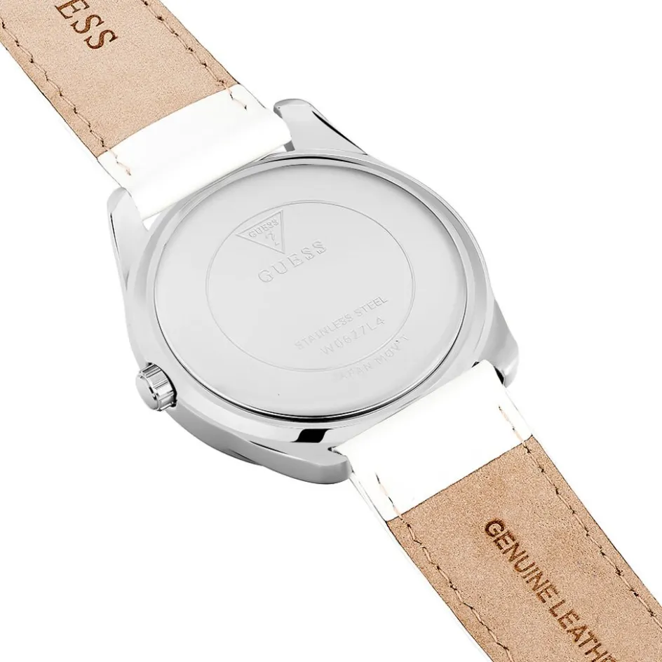 Montre Guess G Twist Acier Blanc Ronde Quartz 39mm Fond Argente Bracelet Cuir Blanc W0627l4