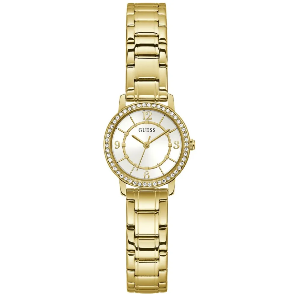 Montre Guess Melody Acier Dore Ronde Quartz 28mm Fond Blanc Lunette Strass Bracelet Acier Dore Gw0468l2
