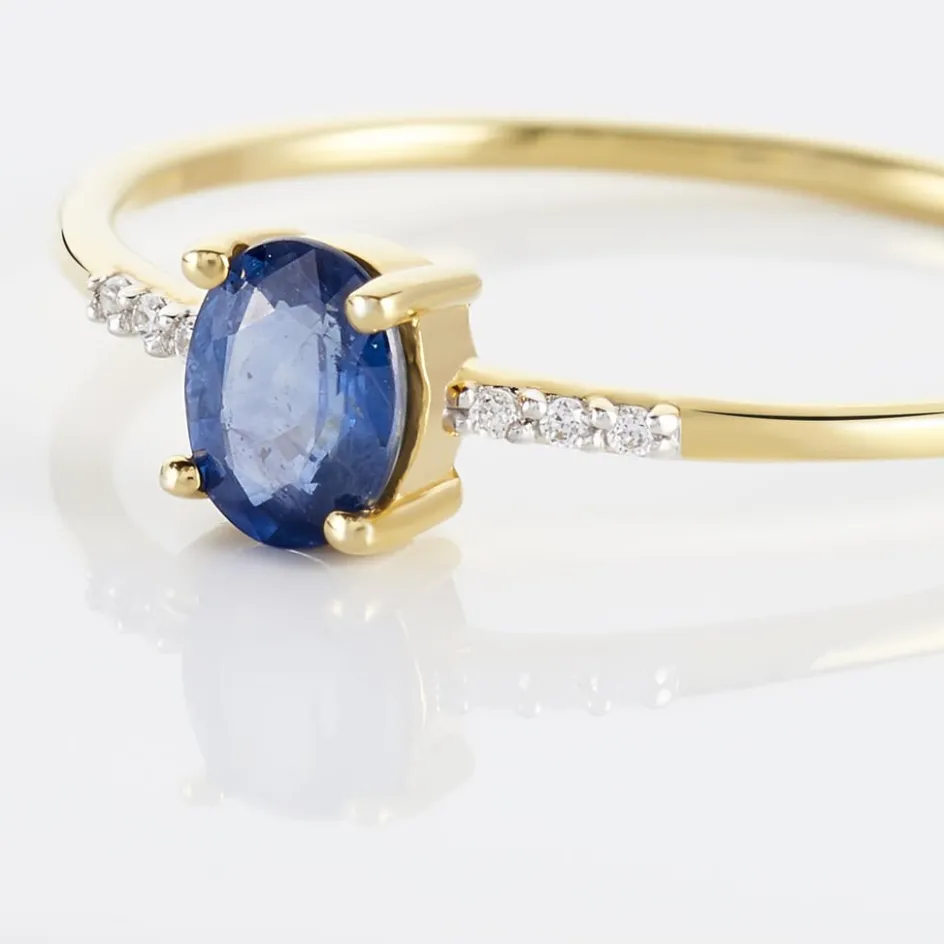 Bague Or Jaune 375/1000 Saphir Central Serti 4 Griffes Accompagne Diamants
