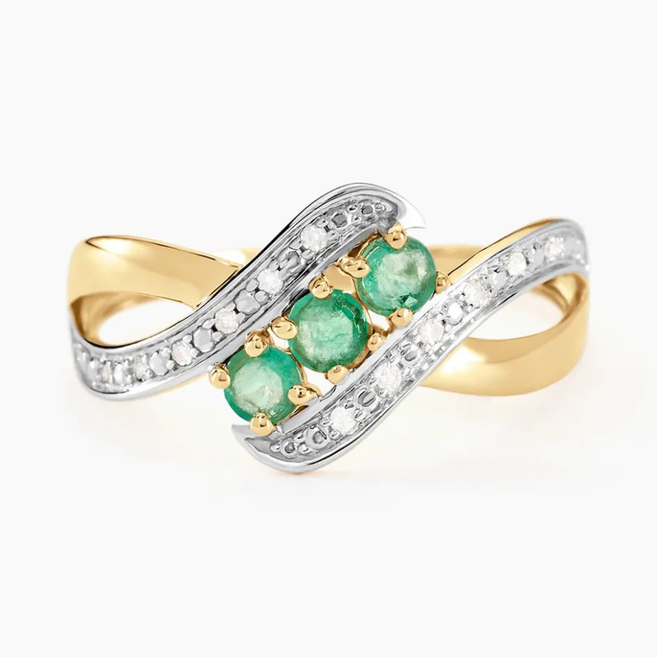 Bague Or Jaune 375/1000 Trilogie Emeraude Pavage Diamants