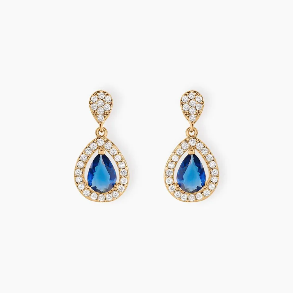 Boucles D’oreilles Plaqué Or Jaune Pierres Bleues Entourages Oxydes De Zirconium