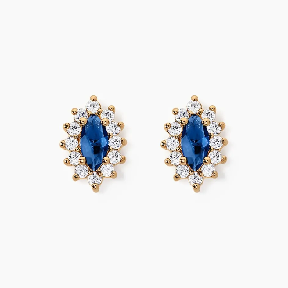 Boucles D’oreilles Puces Plaqué Or Entourages Marguerites Oxydes De Zirconium Pierres Bleues Centrales Formes Navettes
