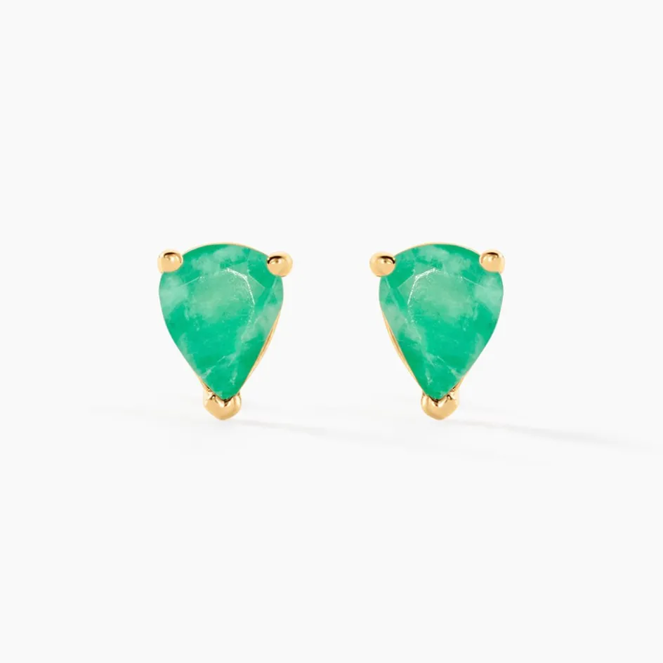 Boucles D’oreilles Puces Or Jaune 375/1000 Emeraude Poire Serti Griffes 0.6ct